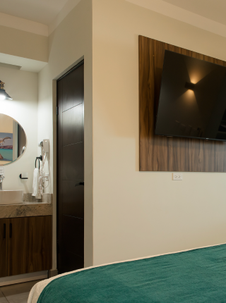 Ubicados en segunda planta, los studios tipo B cuentan con una cama y un sofá cama Queen size, cocina equipada, SMART TV de 55", toallas de cuerpo y alberca para 4 personas, una toalla de mano y un tapete de baño.
