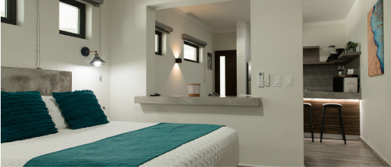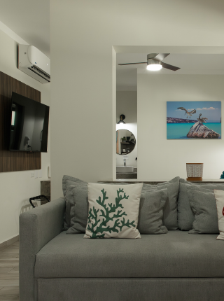 Ubicados en primera planta, los studios tipo A cuentan con una cama y un sofá cama King size. Cocina equipada, SMART TV de 55", toallas de cuerpo y alberca para 4 personas, una toalla de mano y un tapete de baño.